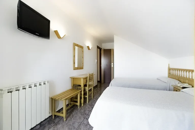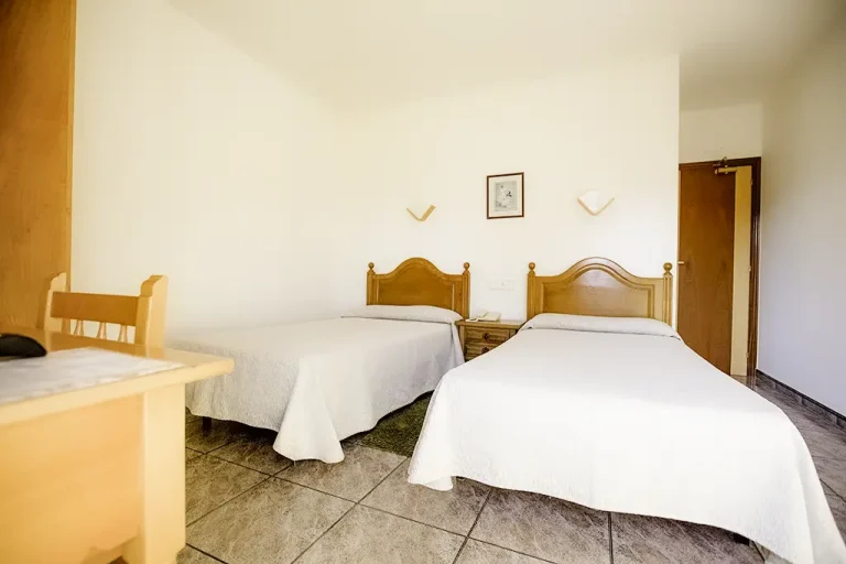 Dois quartos que comunicam internamente, um dos quartos tem cama de casal e o outro quarto tem 2 camas individuais.
